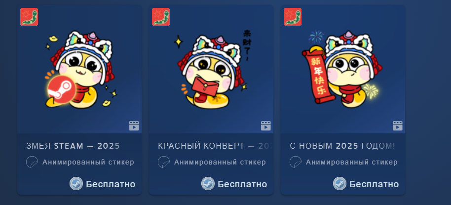 Коллекция «Лунный новый год — 2025» состоит из трёх анимированных стикеров, которые можно использовать при общении в чате Steam.