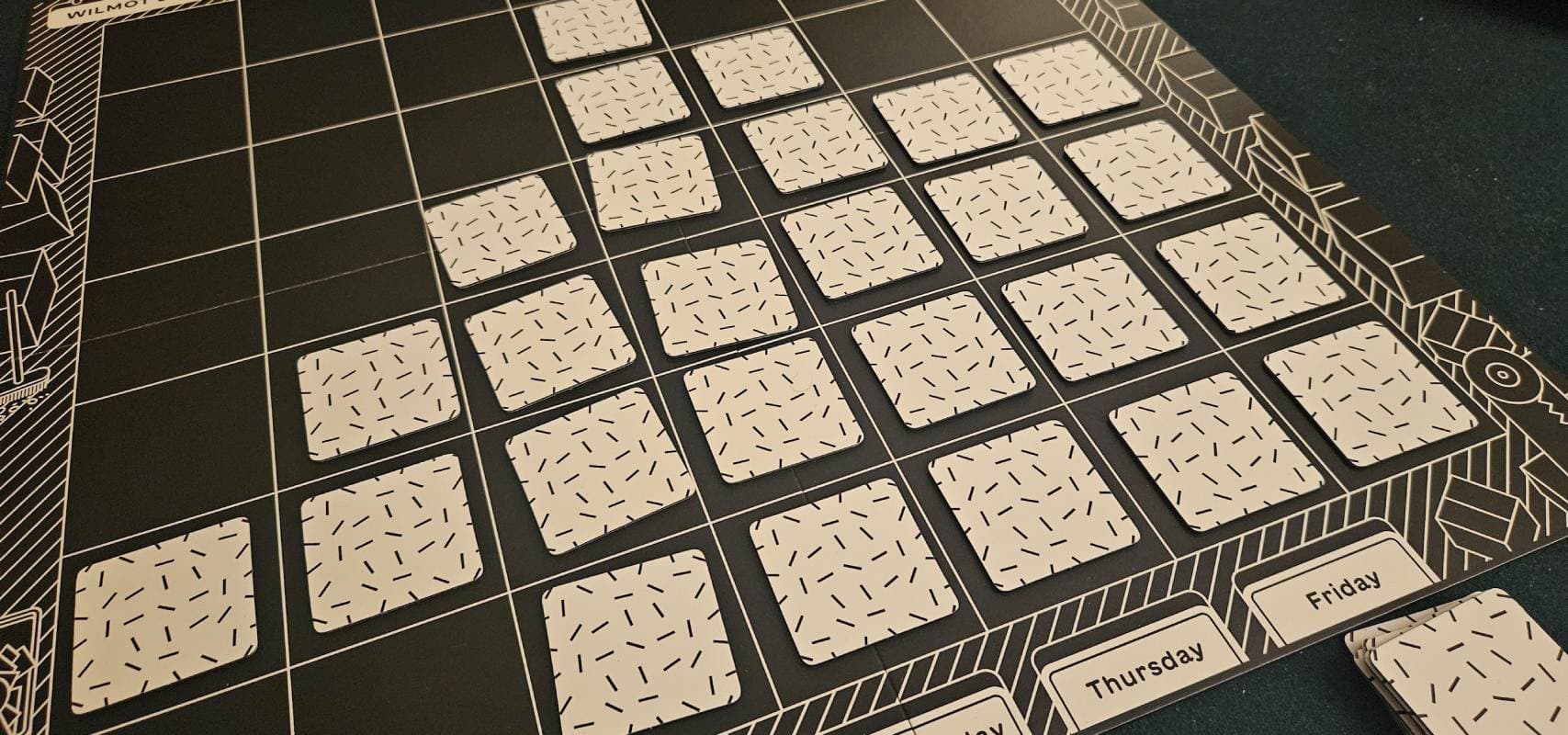 В «Складе Уилмота» геймерам предстоит размещать на игровом поле различные вещи (вниз лицом), являющиеся тайлами с абстрактными изображениями, запоминать их месторасположение и придумывать невообразимые истории, чтобы затем достать необходимый товар и передать его в руки клиента.