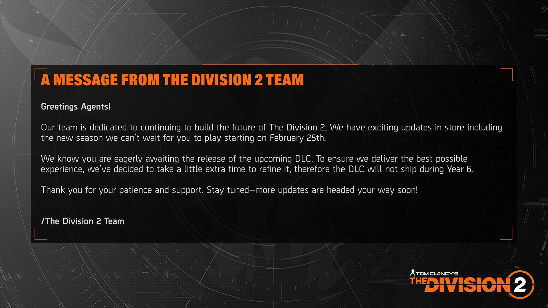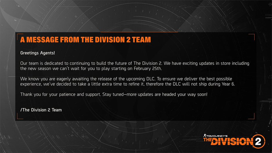 «Мы знаем, что вы с нетерпением ждете выхода предстоящего DLC. Чтобы гарантировать наилучший возможный [игровой] опыт, мы решили потратить немного больше времени на его доработку [поэтому] DLC не выйдет в течение 6-го [года поддержки]».