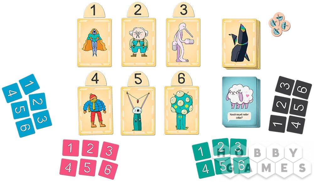 В комплекте настолки получится обнаружить 69 двухсторонних карт леших, 45 двухсторонних карт вопросов, 48 жетонов голосования, шесть жетонов номеров, восемь жетонов связи и правила игры.