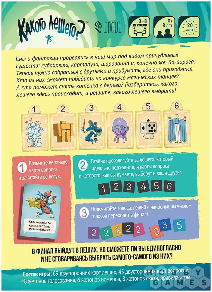 Задача – выбрать, который из леших, по мнению игрока и по мнению большинства, лучше всего подходит для озвученной ситуации. Затем участники раскрывают свой выбор всем за столом, а пользователь, набравший абсолютное большинство голосов, проходит в финал.
