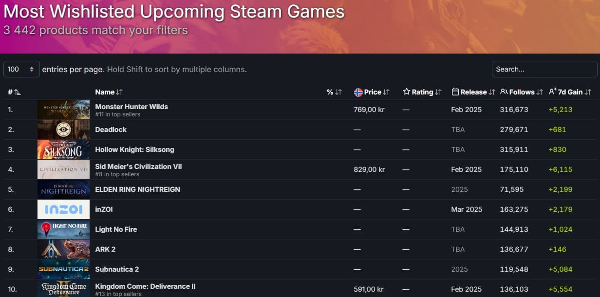 Monster Hunter Wilds ещё не вышла, а уже покоряет Steam. Игра Capcom стала самой желаемой в сервисе, обогнав Hollow Knight: Silksong, Deadlock и Elden Ring: Neightreign.