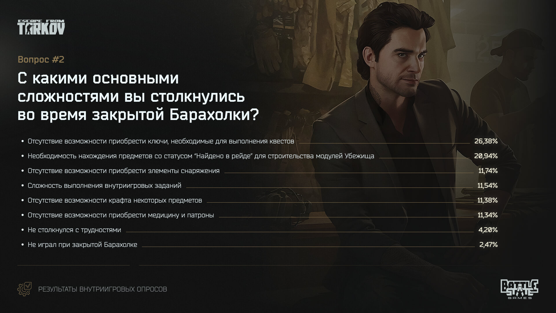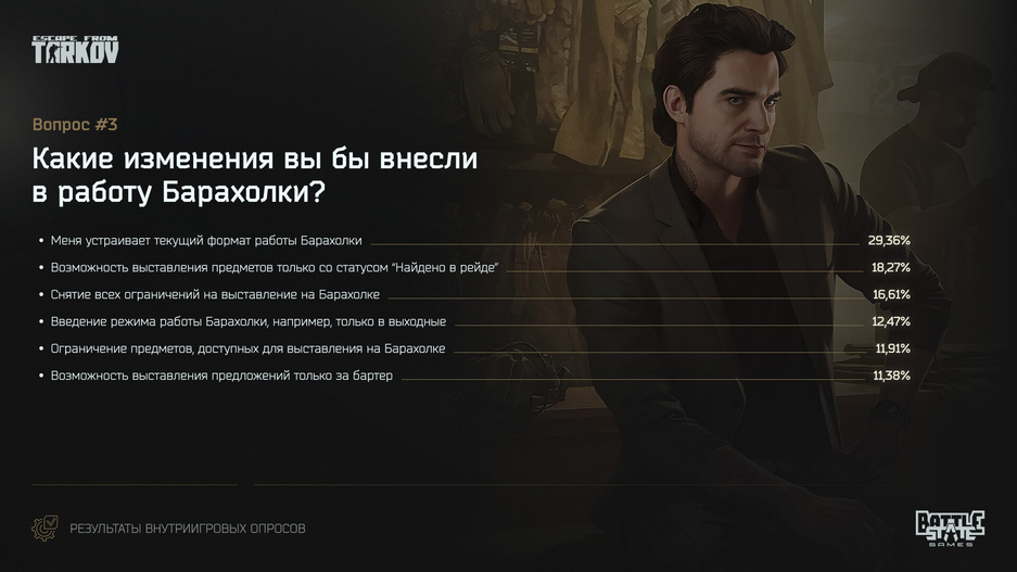 Создатели Escape from Tarkov недавно подвели результаты опроса сообществ. Разработчиков интересовало впечатление игроков от нового вайпа, где отложили запуск Барахолки.
