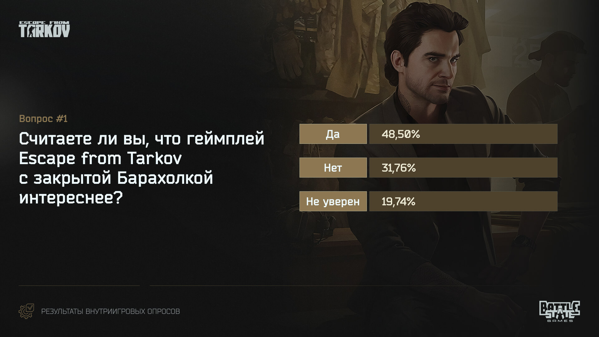 Почти половина опрошенных считают, что геймплей Escape from Tarkov с закрытой Барахолкой интереснее. 31,76% ответили «нет», а «не уверен» — 19,74%.