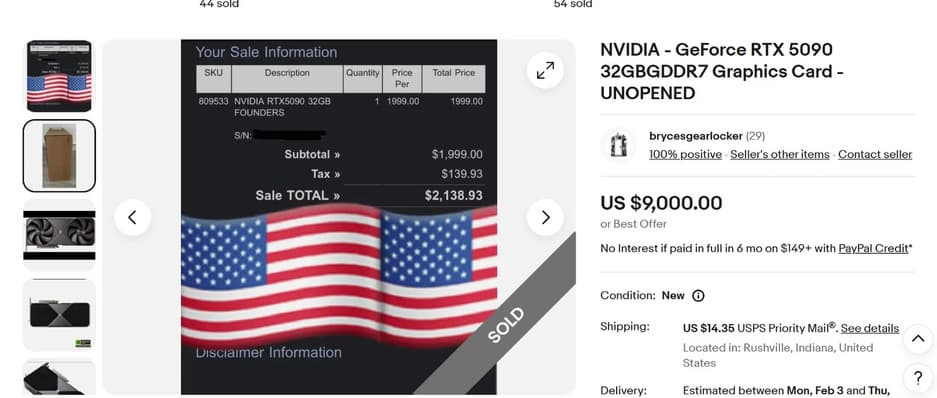 RTX 5090, новая видеокарта от Nvidia, вызвала не только ажиотаж, но и скандалы. Продавцы на eBay выставляют её по заоблачным ценам, доходящим до $9000, намного дороже розничной цены.