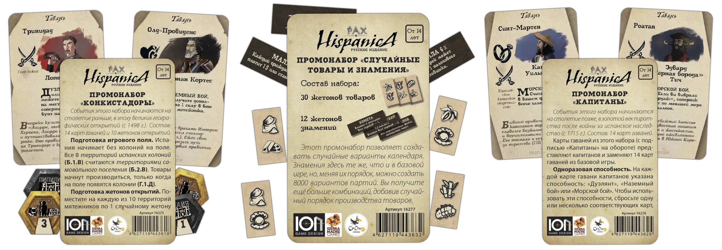 Еще можно приобрести промонаборы «Капитаны», «Случайные товары и знамения» и «Конкистадоры» (каждый стоит 1090 рублей), содержащие новые карты или жетоны.