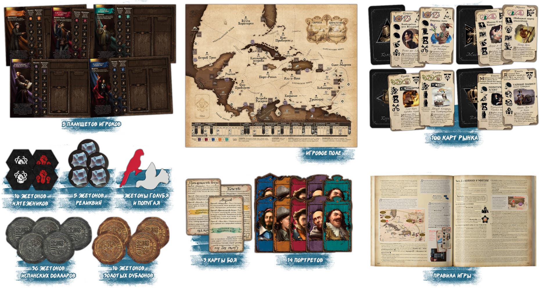 Внутри коробки удастся обнаружить игровое поле с календарём, планшет философии, розеттский камень, пять планшетов игроков, 53 фигурки работников, 100 карт рынка, 16 фишек галеонов, 14 карт гаваней, три карты боя, 20 фишек сундуков, два кубика, 10 жетонов фортов, 32 жетона колоний, 10 жетонов соборов, 30 жетонов библий, 10 жетонов мятежников, пять жетонов реликвий, жетон Голубя, жетон Попугая, 36 жетонов серебряных испанских долларов, 14 жетонов портретов и 10 жетонов золотых дублонов.
