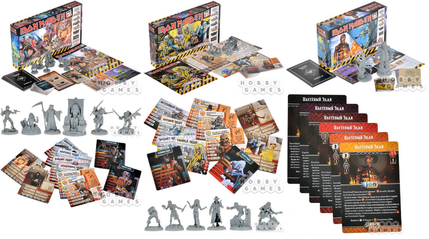 Права на изображения принадлежат Hobby World и CMON. Источники: Hobby Games – «Смерть на коне», «Iron Maiden. Набор №1», «Iron Maiden. Набор №2», «Iron Maiden. Набор №3».