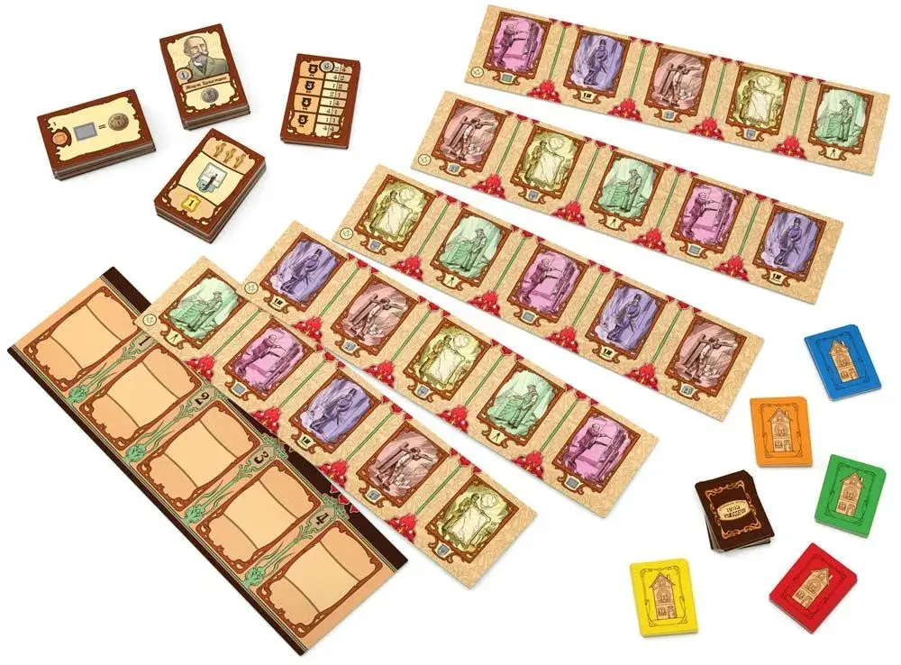 - 30 жетонов здания в цветах игроков, 12 жетонов Прекрасной эпохи, 32 карточки меценатов, 30 карточек славы, 12 карточек фондовой биржи, 32 карточки Прекрасной эпохи, 30 жетонов произведений искусства, 30 монет номиналом пять бельгийских франков;