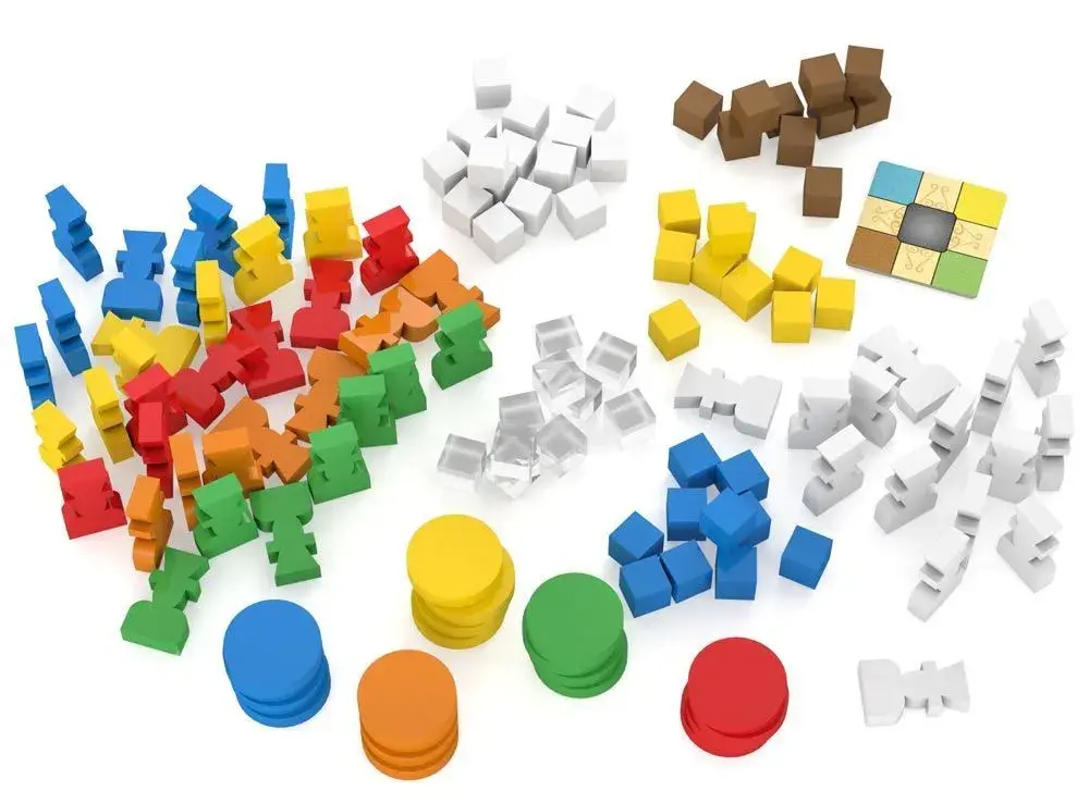 - 70 монет номиналом один бельгийский франк, один жетон стрелки, пять жетонов 100/200, две ножки циркуля и одна заклёпка, 35 фишек архитектора в цветах, четыре фишки, 20 диском в цветах игроков, 40 кубиков благородных материалов, 15 белых кубиков материала джокера.