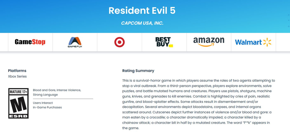 ESRB выдала возрастной рейтинг Resident Evil 5 для Xbox Series — игроки считают, что Capcom готовит переиздание. Игре присвоили рейтинг M (Mature 17+).