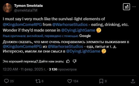 Он сейчас играет в Kingdom Come: Deliverance 2 и особенно заинтересовался системой выживания, включая необходимость следить за едой и водой. Он выразил интерес, могут ли такие элементы появиться в следующей Dying Light: The Beast или даже предыдущих частях.