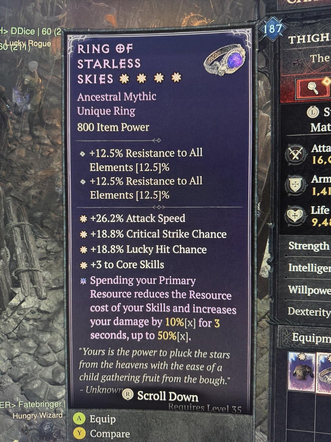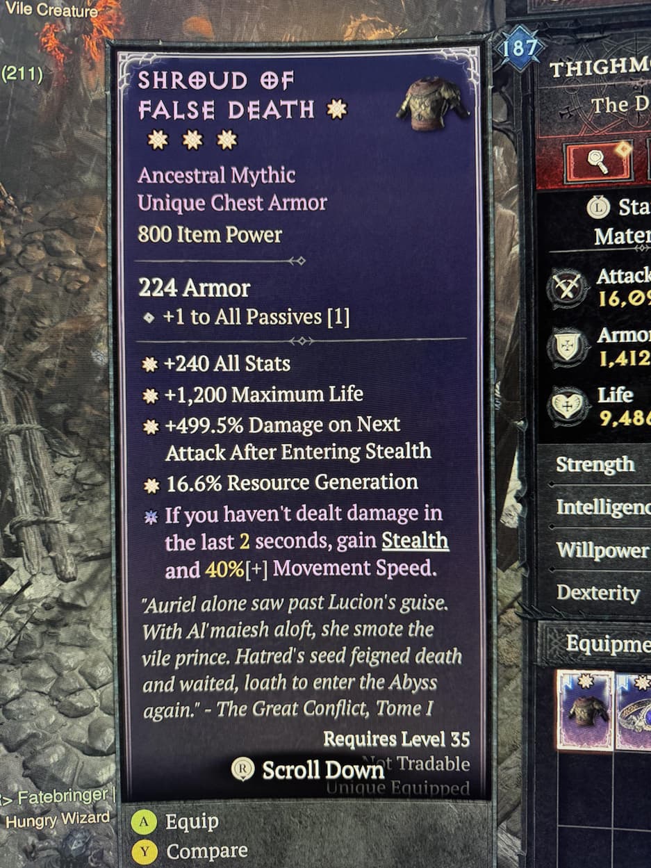 Пользователь Reddit с ником lolurtrashkiddo получил «Кольцо беззвездных небес» и «Покров притворной смерти». Первый снижает стоимость умений и увеличивает урон на 10% в течение трёх секунд (до 50%). Второй повышает скорость передвижения и скрытность, если игрок не наносил урон две секунды. Оба предмета выпали с четырьмя афиксами, что делает их максимально мощными версиями.