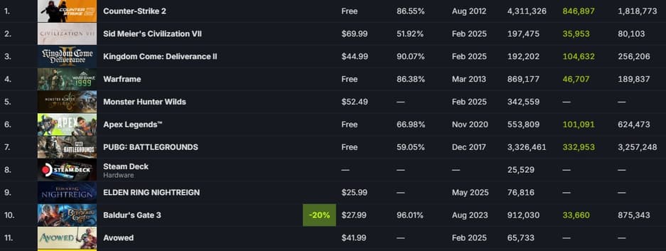 При этом проект уже обошел Avowed, которая сегодня выйдет в раннем доступе - девятое место против одиннадцатого.