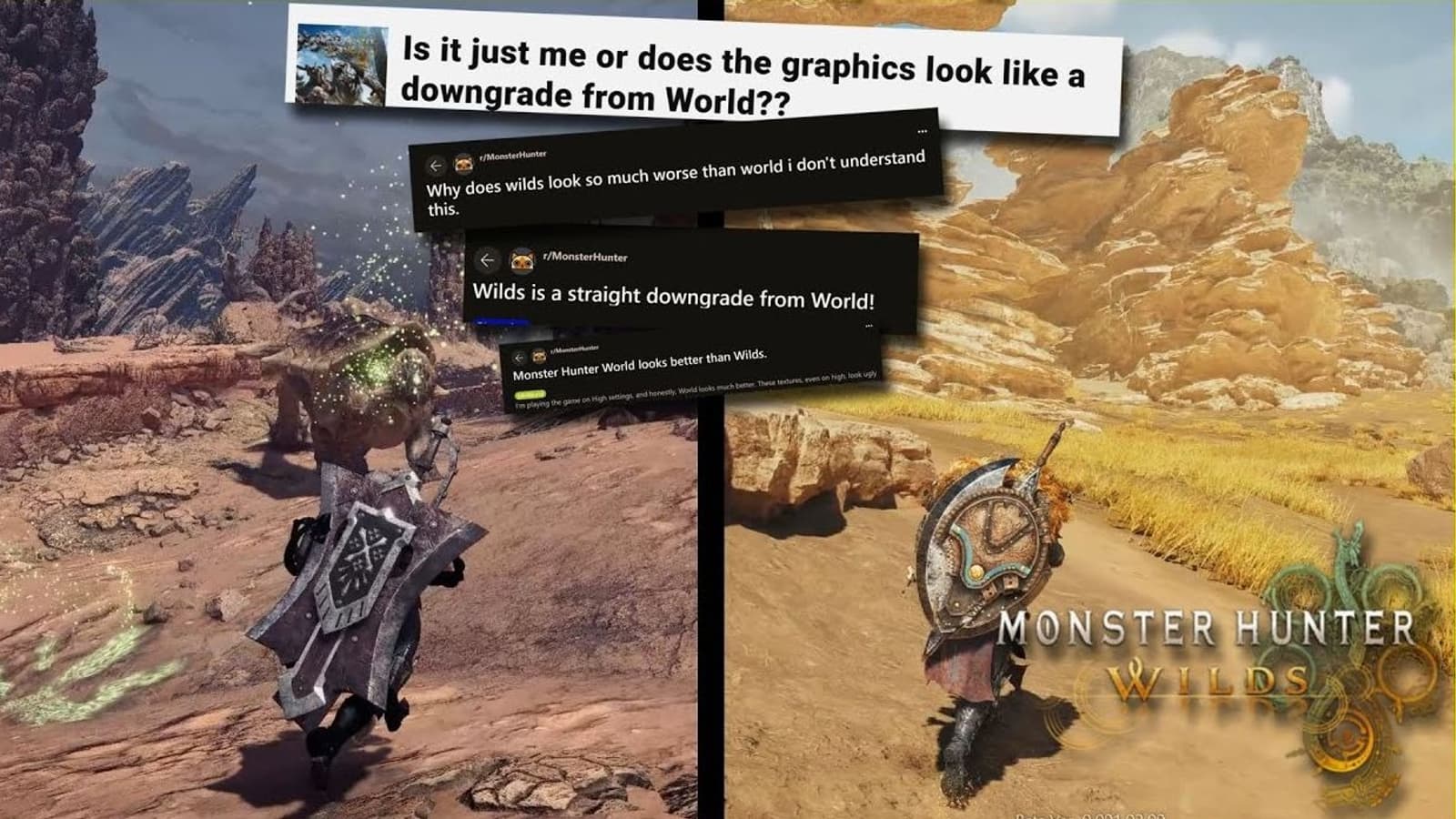 Для того чтобы развеять слухи о графическом даунгрейде, Блогер Blunty провел сравнение Monster Hunter Wilds и Monster Hunter World на одной и той же ПК-конфигурации. Он использовал настройки Ultra, а также скомпилировал видео, на котором показано, что Wilds, даже с уменьшенными деталями теней, не уступает предшественнику по визуальному качеству. В то время как World работает с дополнительными HD текстурами, Monster Hunter Wilds в сравнении выглядит вполне достойно.