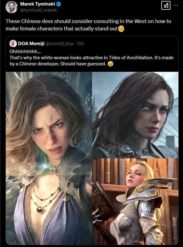 «Аааааа, вот почему белая женщина выглядит привлекательной в Tides of Annihilation — игру делает китайская студия. Мне следовало догадаться».