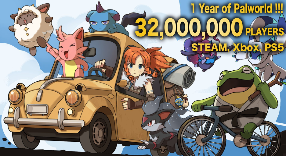 «Более 32 миллионов укротителей палов! Прошел год с момента выхода Palworld, и благодаря вам, наши поклонники, Palworld превысил 32 миллиона игроков на всех платформах! (Steam, Xbox, PS5)