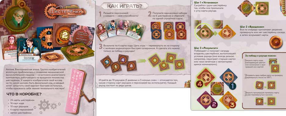 Чтобы победить, необходимо ввести в машину последнюю карту кода, либо к концу 10 раунда оказаться изобретателем, в чьём коде больше всего введённых карт. Доставку настольных игр «Трик-н-Шеф» и «Шестерёнки» стоит ожидать в марте 2025 года.