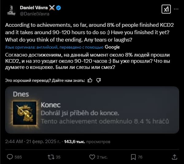 Финал Kingdom Come: Deliverance 2 смогли увидеть лишь 8% игроков. Игра привлекает внимание игроков глубиной и большим миром, что делает продолжение одним из самых длинных одиночных приключений на рынке. Среднее время прохождения составляет 90-120 часов, а некоторые растягивают путь к концовке на сотни часов.