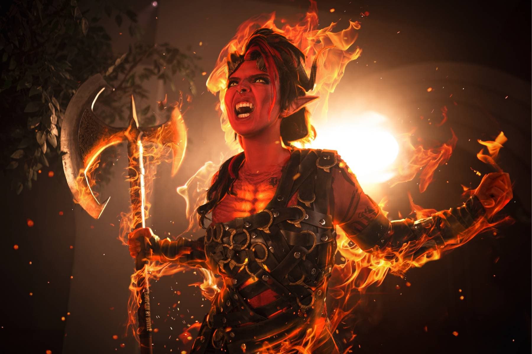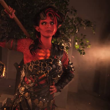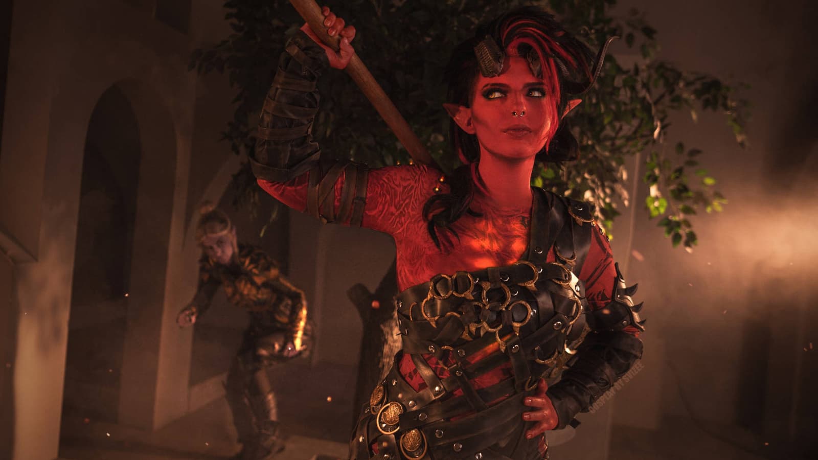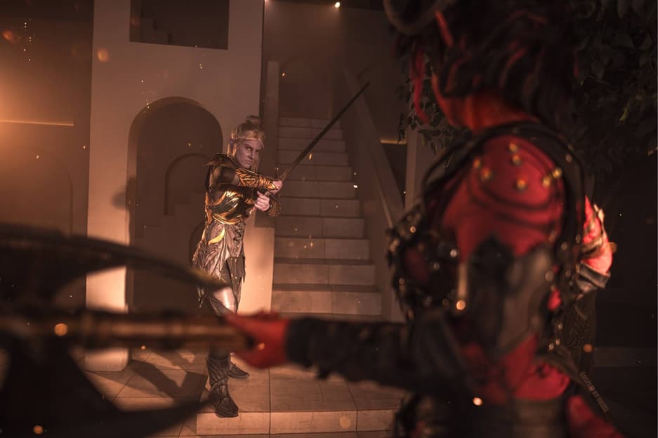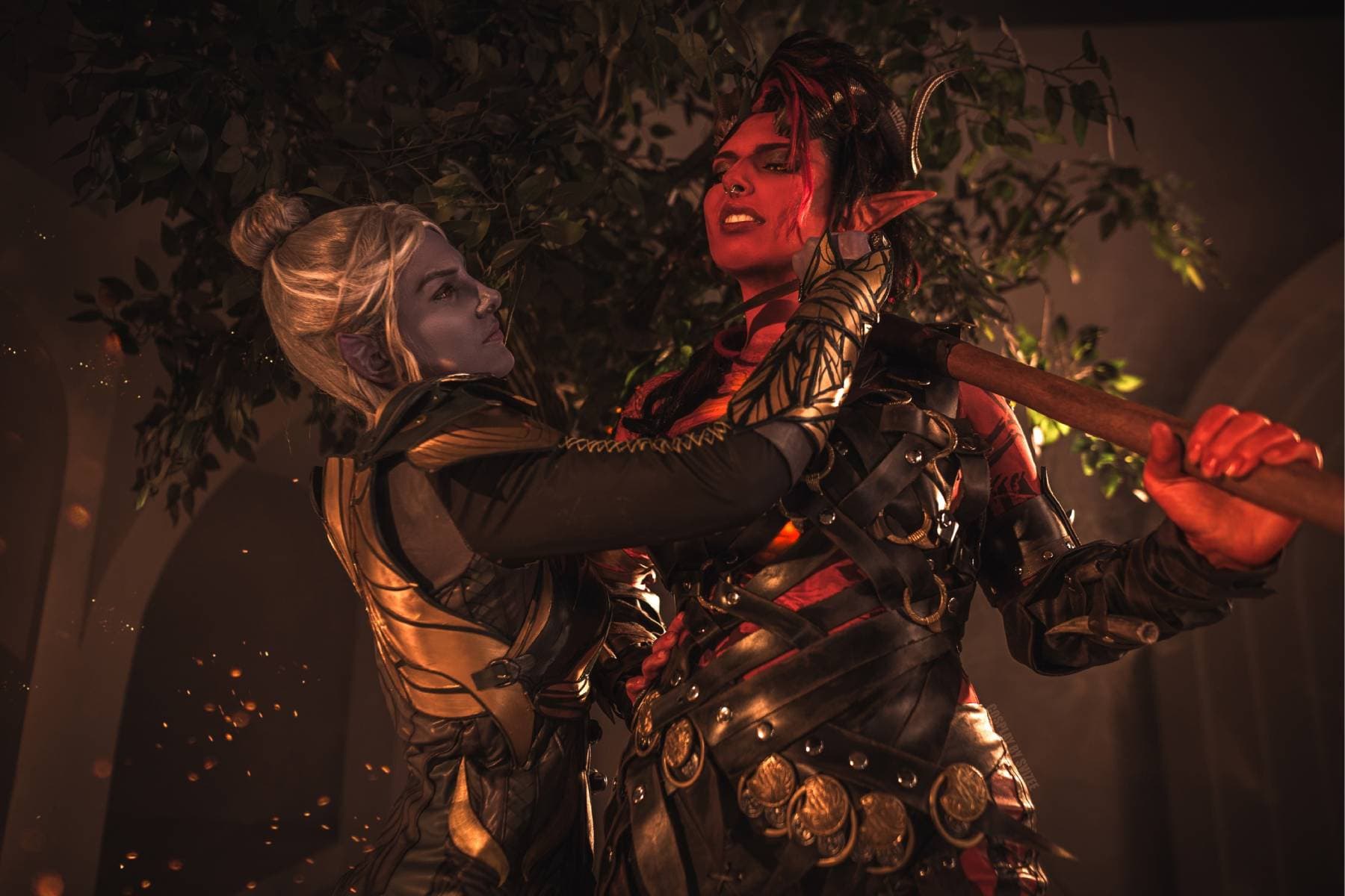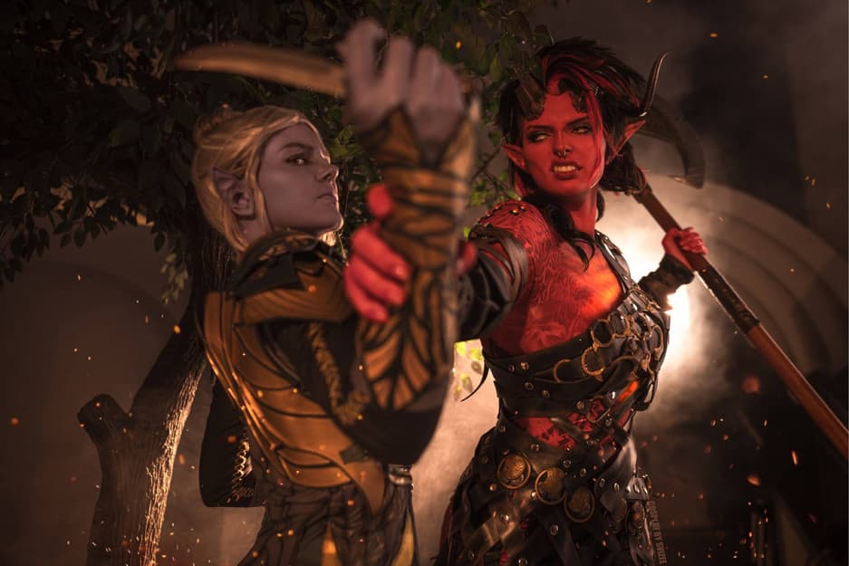 Модели Waters и Svizee перевоплотились в дроу Минтару и тифлинга Карлах, чтобы показать фанатам RPG Baldur's Gate 3 битву между этими персонажами, способными стать спутниками главного героя.