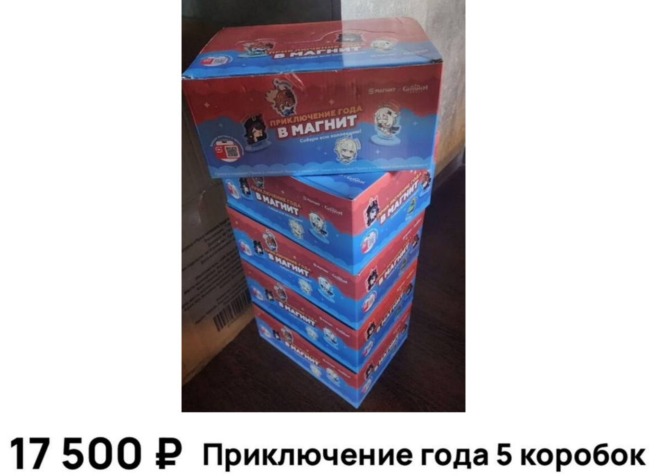Напрямую авторы некоторых объявлений не стали указывать «Genshin Impact», используя иные формулировки, вроде «Приключение года» (или указывали название как «Геншин Импакт»). Стоимость одного маленького «лутбокса» оценивали в ~400 рублей, а 5 коробок с пакетиками мерча были готовы продать за 17 500 рублей.