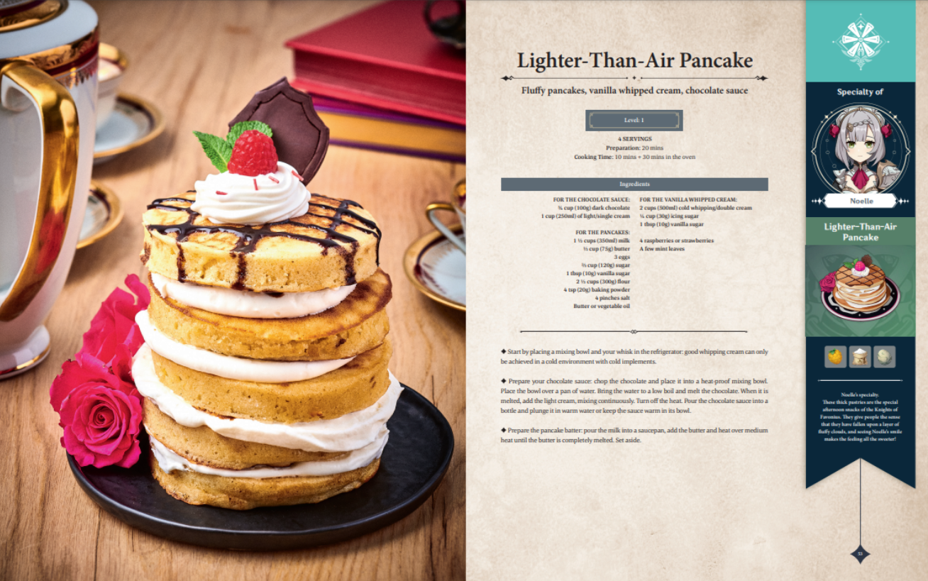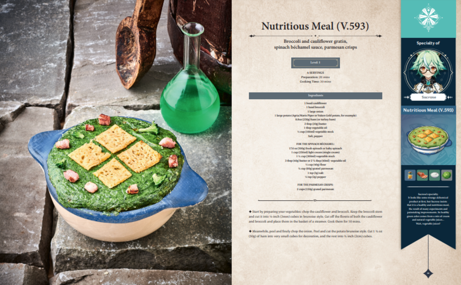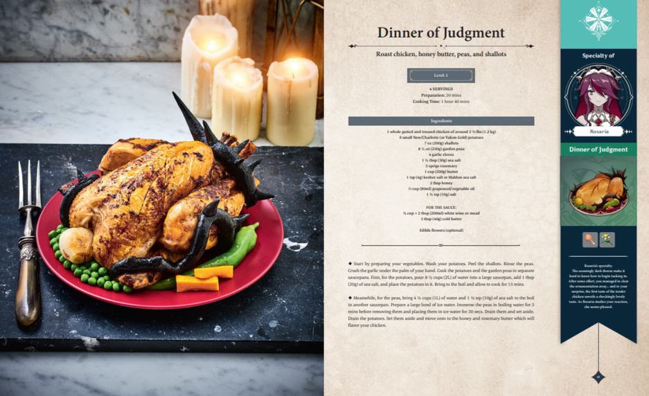 В кулинарную книгу Genshin Impact включат 60 рецептов, вдохновлённых миром игры miHoYo. Пока рецепты Сёгун Райдэн, известной своими (не очень выдающимися) кулинарными способностями, не показали — зато точно будут рецепты блюд от Ноэлль, Розарии и Сахарозы, представили соответствующие страницы.