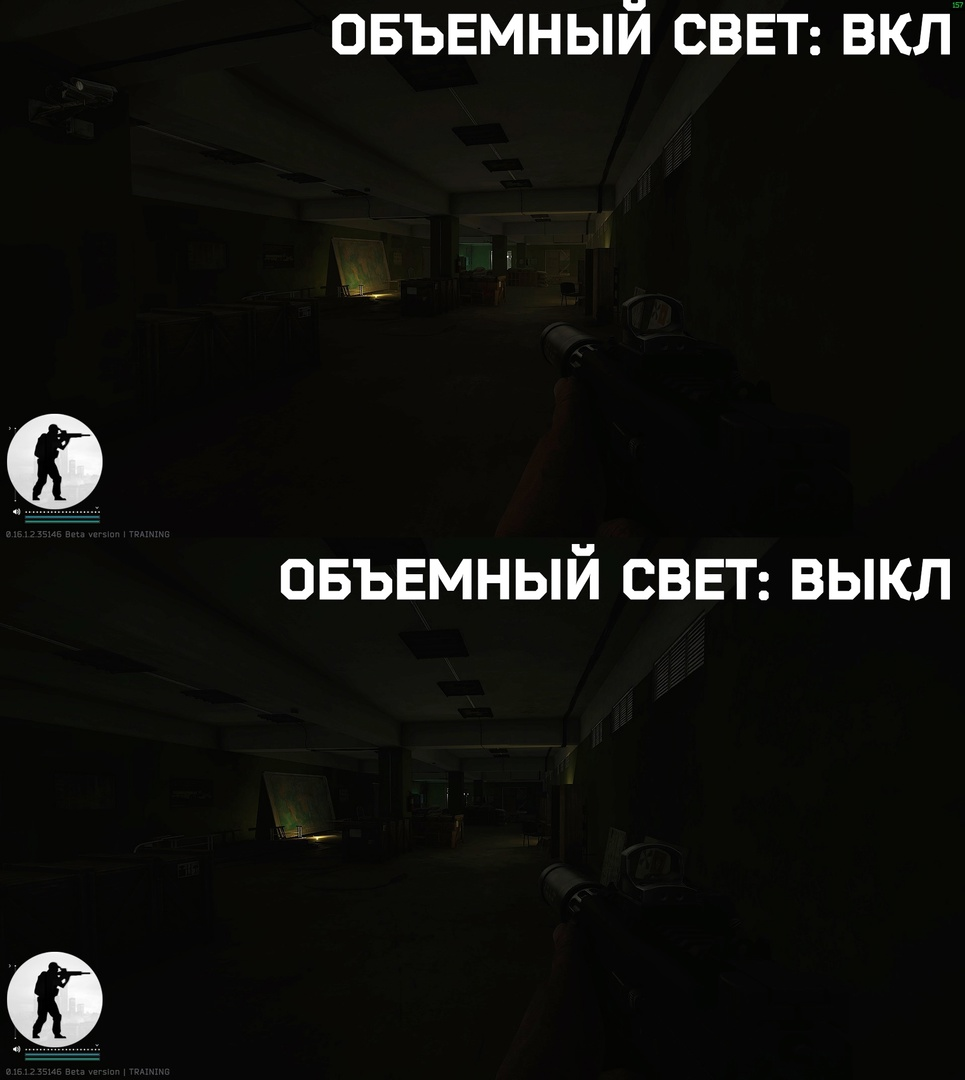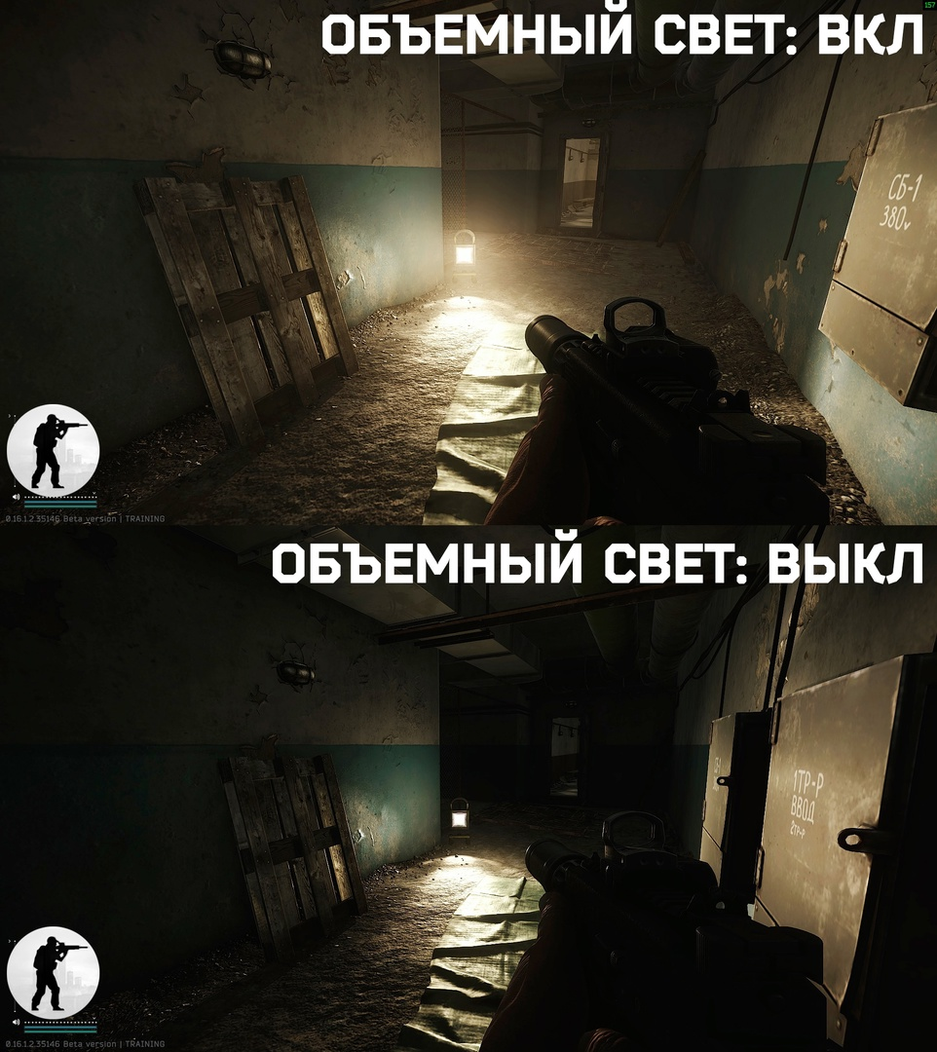 В сообществе «Тарковское Метадвижение» сравнили графику с объёмным светом и без (больше кадров здесь), а затем обратились к игрокам с предупреждением, поскольку отключение негативно влияет на игровой процесс: