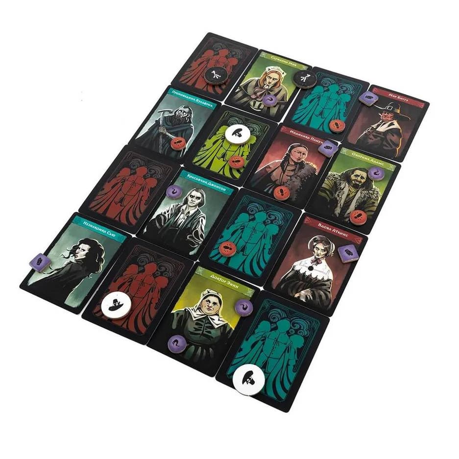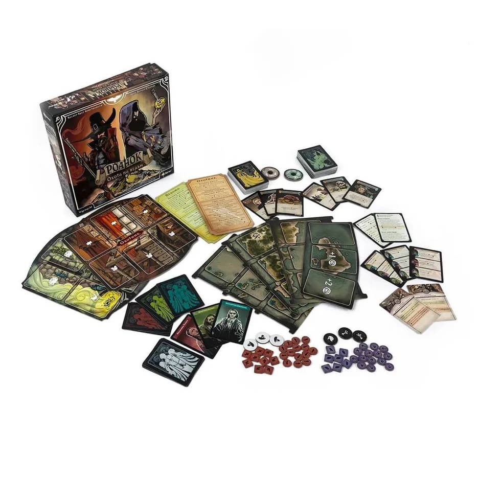 В комплекте удастся обнаружить 50 карт охотника, 50 карт ведьмы, 30 жетонов улик, 30 жетонов секретов, 20 жетонов покорности, девять карт подозреваемых, девять жетонов доказательств, девять карт жителей, три фишки ведьмы, три фишки охотника, пять игровых памяток, два диска влияния, две карты сценариев, планшет поселения, планет охотника, планшет ведьмы, планшет чар, правила игры.