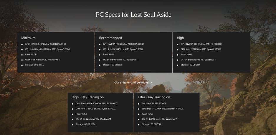 Разработчики Lost Soul Aside раскрыли системные требования игры на ПК. Для минимальных настроек необходимы Intel Core i5-10400 или Ryzen 5 3600, GTX 1060 или RX 5500 XT и 16 ГБ оперативной памяти.