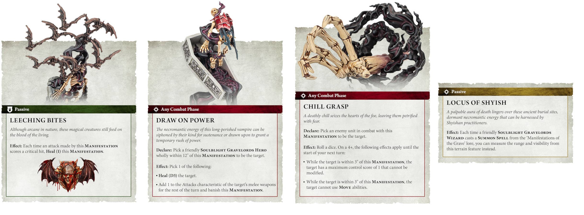 Sanguine Swarm и Leeching Bite: каждая критическая атака летучих мышей из этой манифестации вылечивает её на одно очко. Более детальную информацию о вышеуказанных новинках можно будет обнаружить в будущем боевом томе Бездушных Повелителей Могил (Battletome: Soulblight Gravelords).