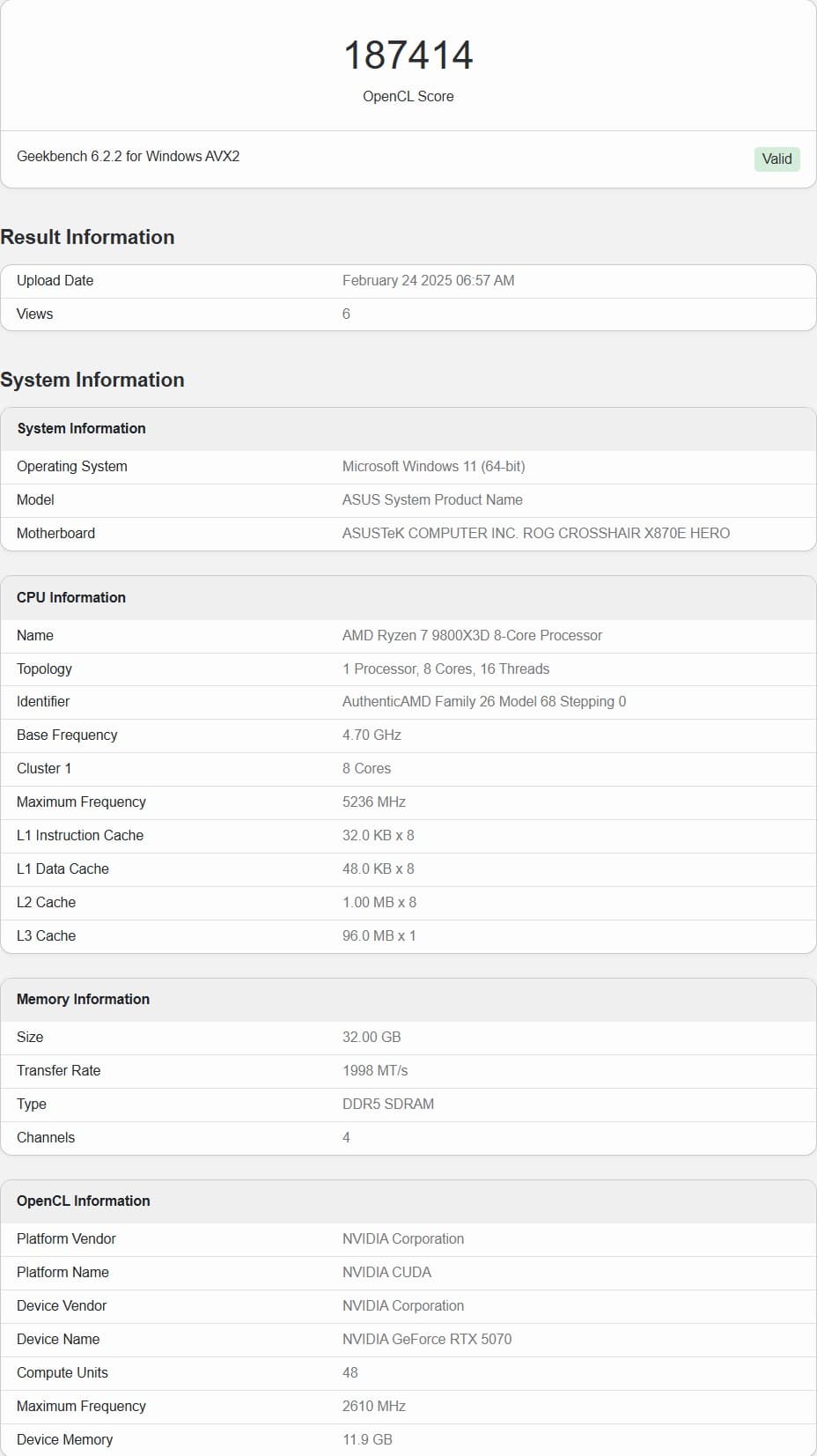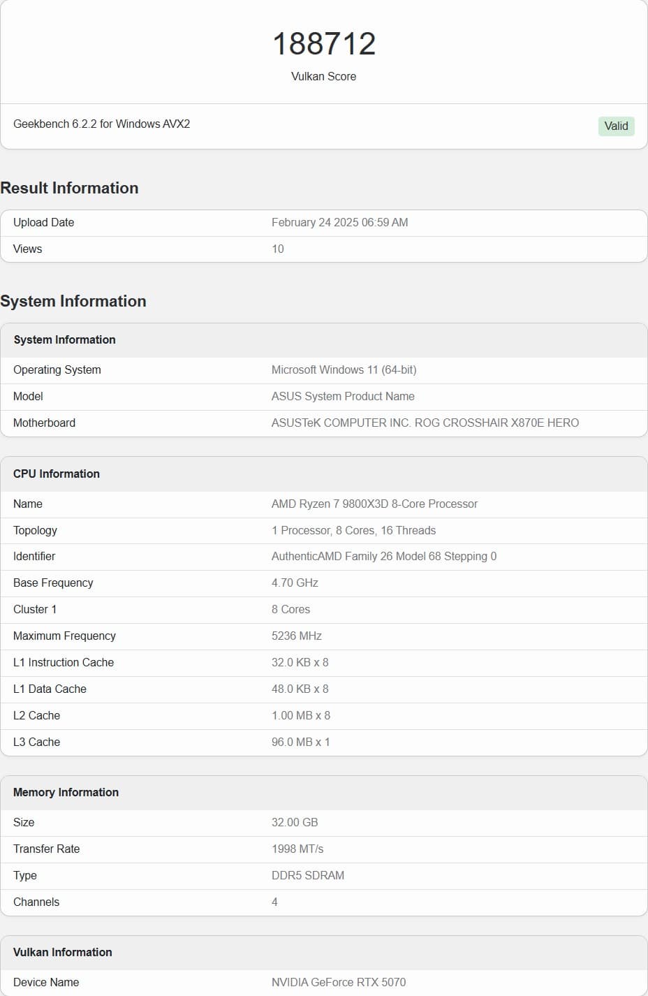 В тесте OpenCL RTX 5070 набрала 187 414 баллов против 167 924 у RTX 4070. В Vulkan разница ещё больше — 188 712 против 156 601. Это подтверждает заявления NVIDIA о приросте производительности в пределах 15–20%.