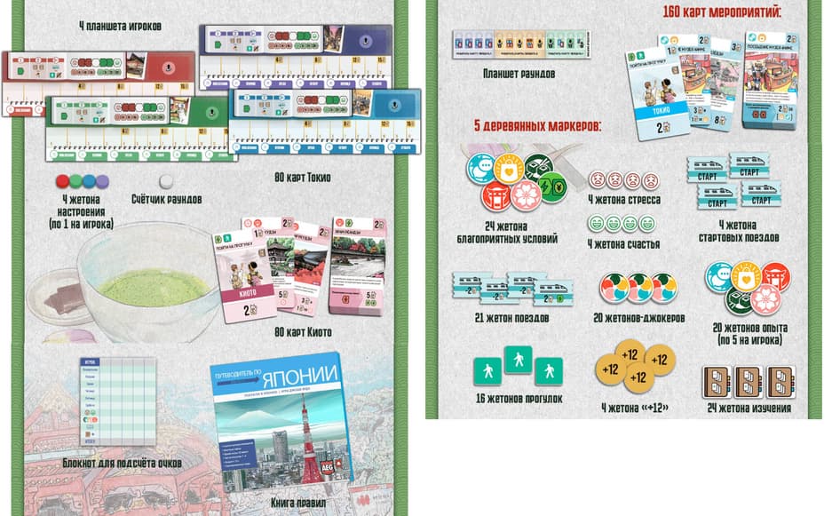 Выпуск «Поехали! В Японию» стоит ожидать летом – осенью 2025 года. Комплектация настолки выглядит так: четыре планшета игроков, 160 карт мероприятий, пять деревянных маркеров, 145 карточнных жетонов, блокнот для подсчёта очков и книга правил.