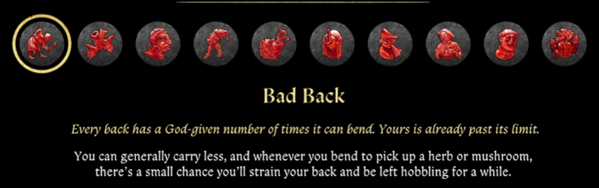 - «больная спина» — снижает максимальный переносимый вес, а также есть шанс получить травму в процессе сбора трав и грибов.