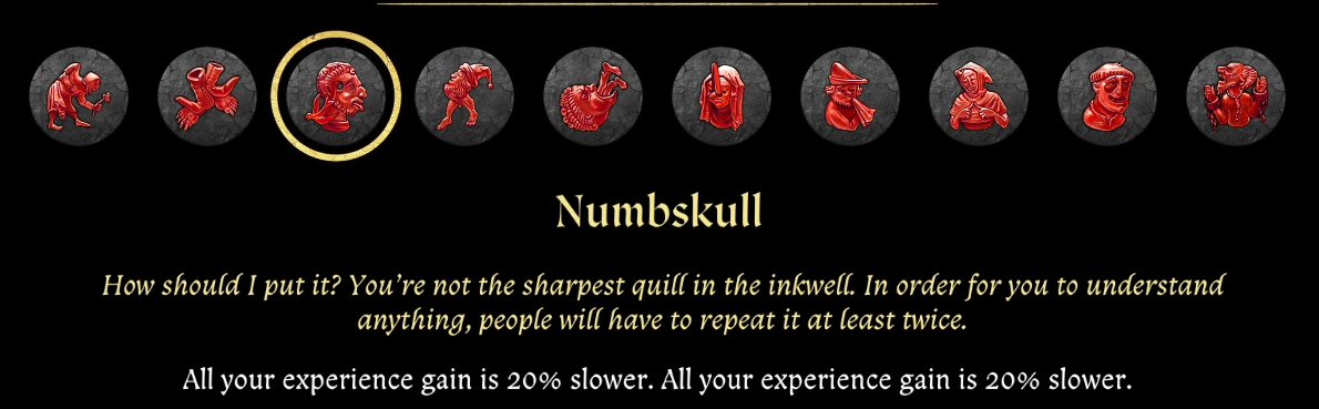 - «тупица» — опыт накапливается на 20% медленнее (авторы обыграли тему перка, в описании дважды повторили его особенность).