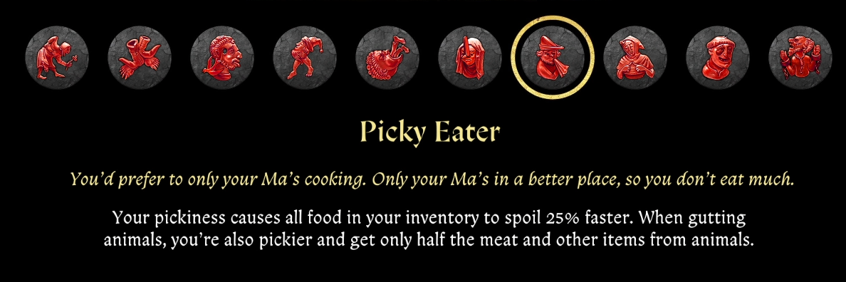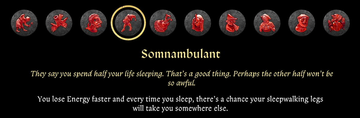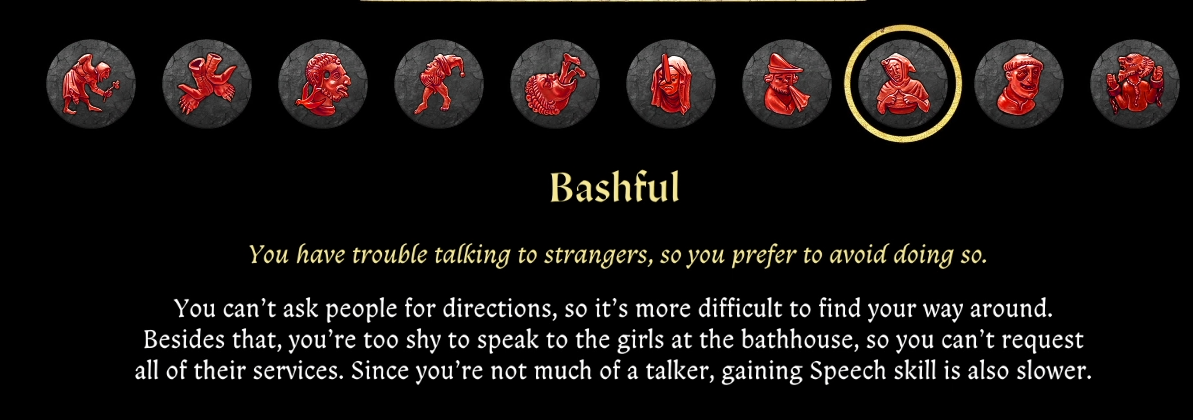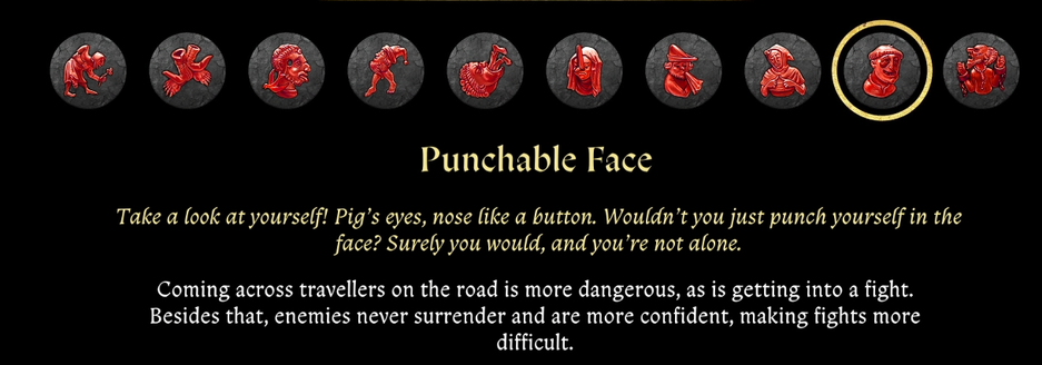 - «противная рожа» — повышает шанс ввязаться в драку с проходящими мимо персонажами, драки будут более сложные (враги перестанут сдаваться и начнут сражаться до последнего).