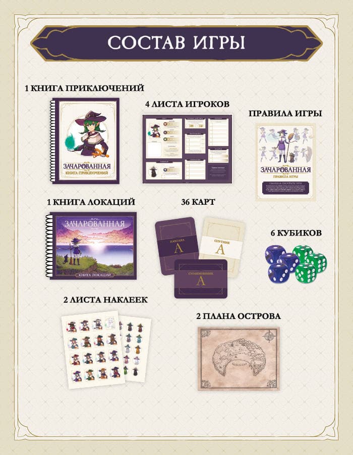 Комплектация коробки выглядит следующим образом: одна книга приключений, четыре листа игроков, правила игры, одна книга локаций, 36 карт, шесть кубиков, два листа наклеек, два плана острова. Доставку «Зачарованной» стоит ожидать в мае 2025 года.