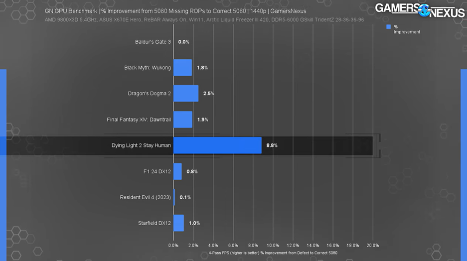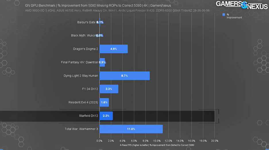 Недавно стало известно о том, что часть видеокарт (0,5%) GeForce RTX 5080 вышла с браком — число ROP ниже заявленного. Одну из таких GPU удалось заполучить автору YouTube-канала Gamers Nexus и была проведена серия игровых тестов, чтобы оценить, насколько велика будет потеря в производительности (NVIDIA говорила о в среднем 4%).