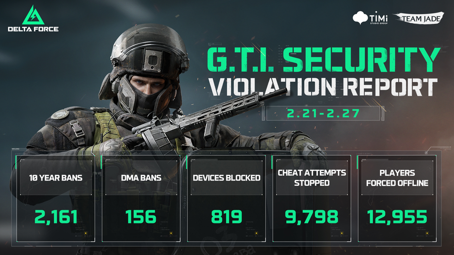 За неделю служба безопасности Delta Force «наказала 2161 чел. из числа игроков, в том числе наложив баны длительностью до 10 лет. Конкретные меры включали: баны ПДП [DMA] — 156 раз(а), блокировку устройств — 819 раз(а), пресечение попыток читерства в реальном времени — 9798 раз(а), и принудительное изгнание игроков в онлайн — 12955 раз(а)».