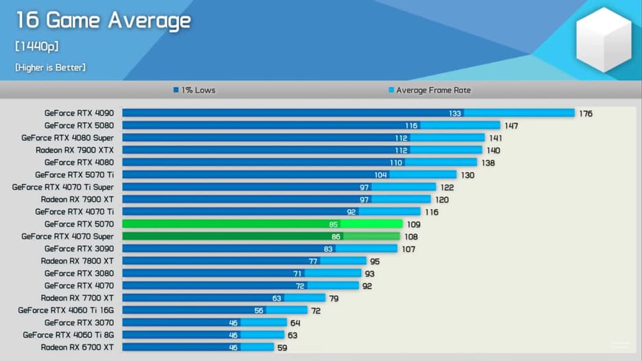 Были и исключения: в Hogwarts Legacy RTX 5070 опередила RTX 4070 Super на 21%. Но в большинстве случаев прирост минимальный.