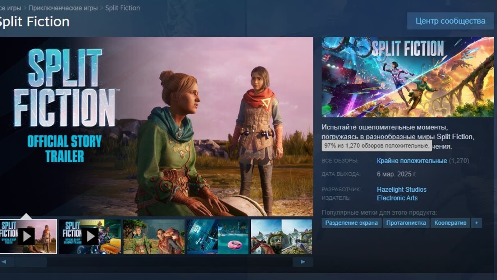Split Fiction - кооперативная игра о двух писательницах, у которой положительные отклики игроков и рецензентов. Она пока не побила рекорд студии Hazelight, суммарное количество игроков в первый день составило более 32 тысяч (рекорд It Takes Two более 71 тысячи игроков), но на момент публикации заметки в игре находится более 60 тысяч игроков. Состоявшийся релиз также совпал с 13-й годовщиной Mass Effect 3, что добавляет символизма в достижение EA.