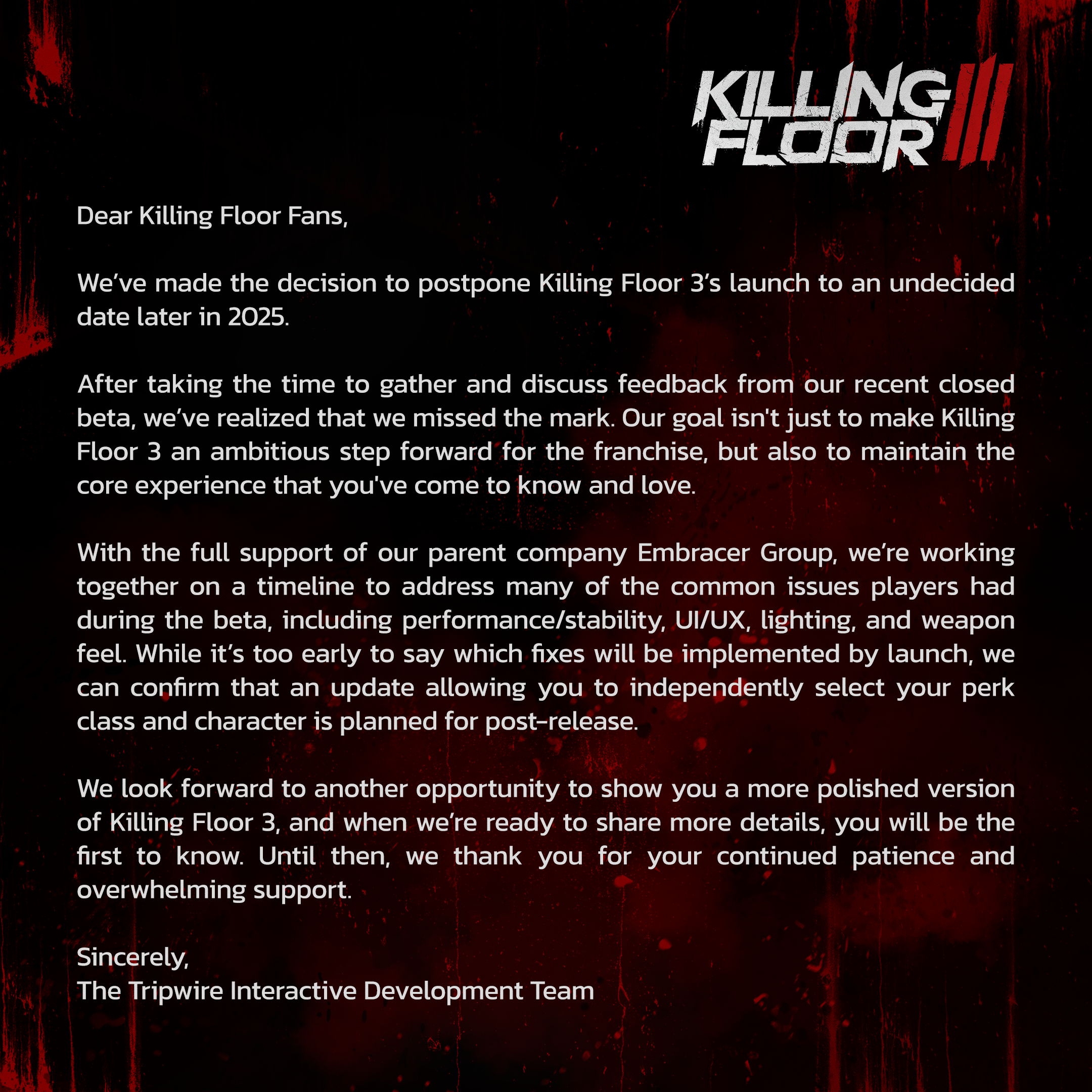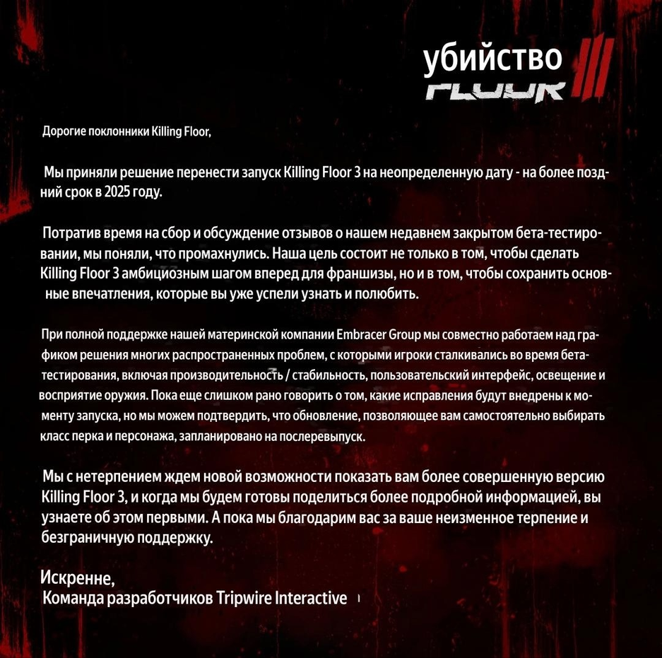 За несколько недель до релиза авторы Killing Floor 3 объявили о переносе игры на неопределённый срок, пока релиз по-прежнему ожидается в 2025 году. Разработчики будут решать проблемы со стабильностью-производительностью, работой оружия и системы освещения, также поработают над графикой. Конкретный список изменений пока не готовы предоставить.