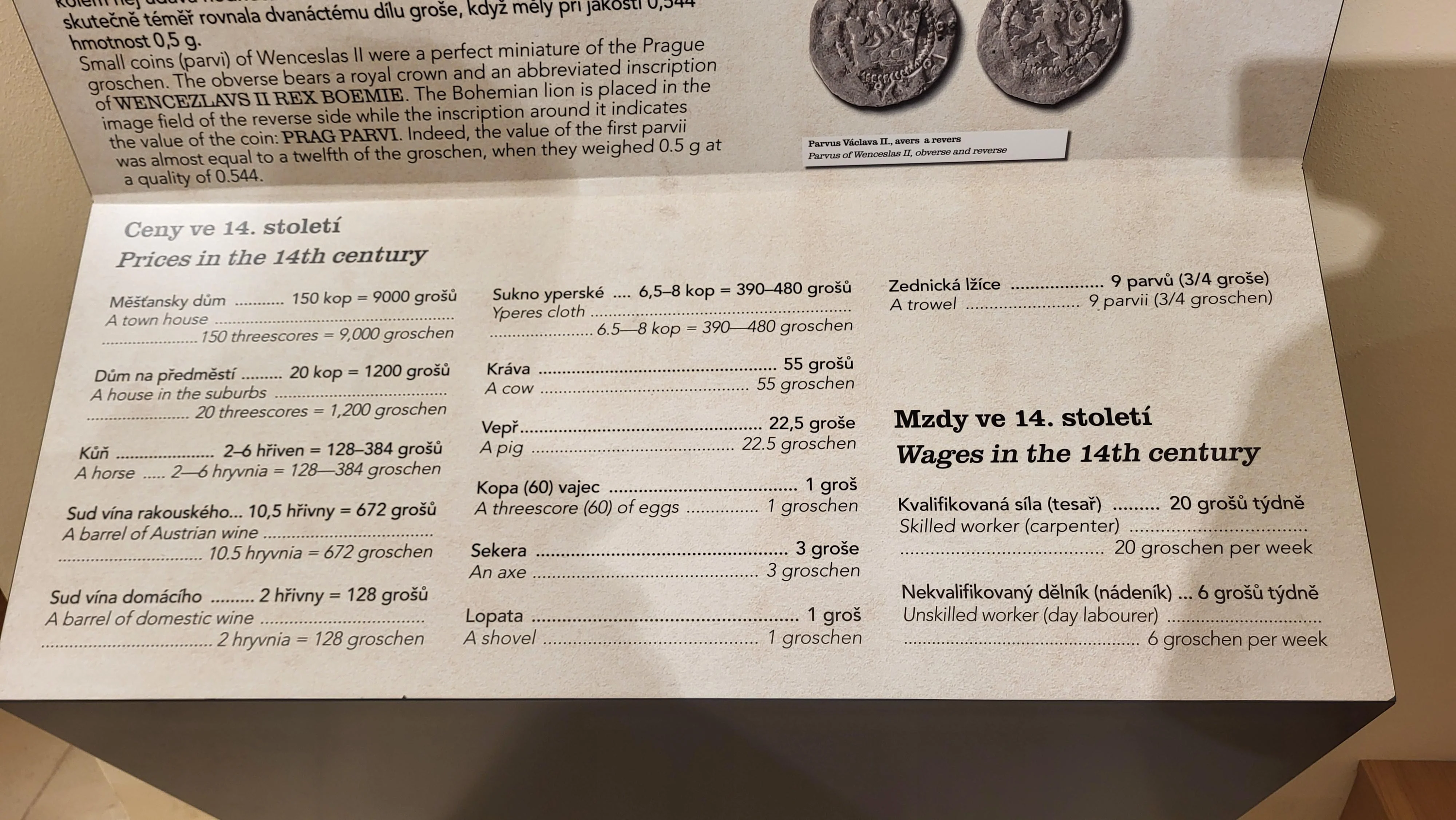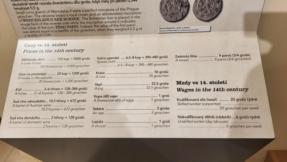 Стоимость свиньи оценивалась в 22,5 грошей, корова 55 грошей, бочонок «местного» вина стоил 128 грошей, а «австрийского» — 672.