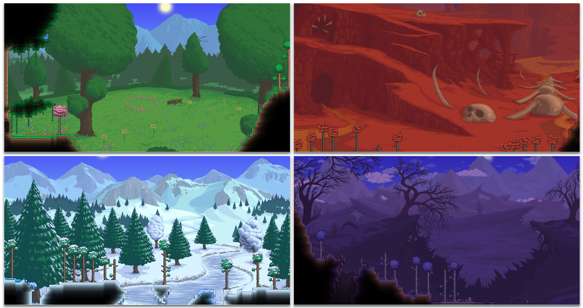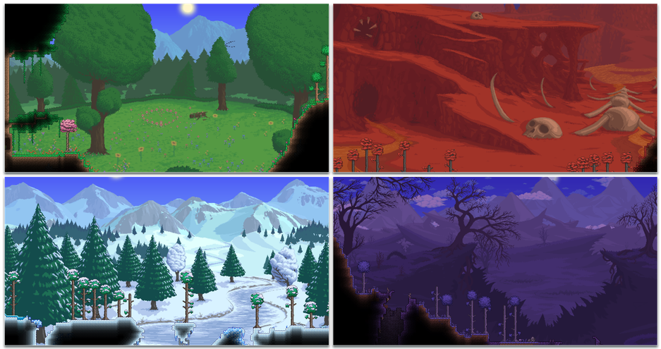 «Одним из долгосрочных аспектов грядущего обновления Terraria стала разработка совершенно новых фонов для биомов. Созданные вручную Luna (Runic Pixels), эти обманчиво детализированные произведения искусства действительно задают настроение и придают свежесть при исследовании каждого мира Terraria. Ниже мы приводим лишь несколько примеров, но у нас уже есть несколько других, готовых к выходу в свет. Убедитесь, что вы выделили время, чтобы внимательно рассмотреть и прочувствовать каждый из них.....»