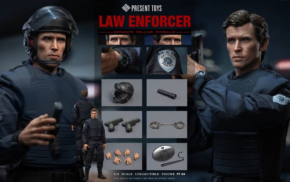 В комплекте получится обнаружить костюм полицейского, тело с суставами, голову с подвижными глазами и внешностью актера Питера Уэллера, шесть пар рук, специальную подставку, шлем, фонарик, два пистолета, наручники и часы.