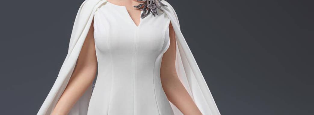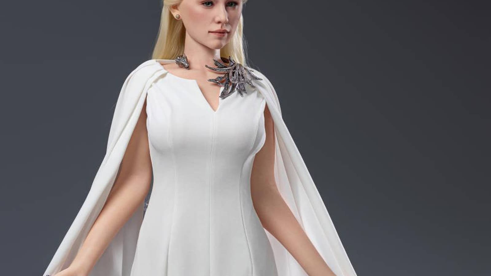 Высота данного коллекционного предмета, а он весит 34 кг, равна 157 см. В комплекте получится обнаружить тело с 27 подвижными суставами, шифоновое платье, голову с подвижными глазами и внешностью актрисы Эмилии Кларк, кожаные ботинки, два кольца, ожерелье в форме дракона, бюстгальтер и шорты, набор для чистки.