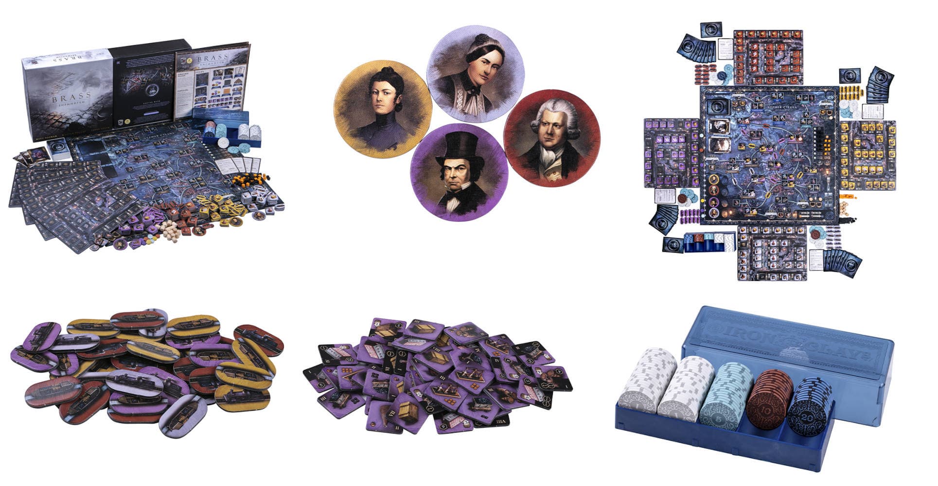 В коробке удастся обнаружить игровое поле, 180 жетонов предприятий, 76 карт, четыре планшета игроков, четыре жетона персонажей, четыре фишки дохода, четыре фишки победных очков, девять жетонов коммерсантов, 15 бочек пива, 56 жетонов сообщения, 18 кубиков железа, 30 кубика угля, 78 фишек денег разного номинала и правила игры.
