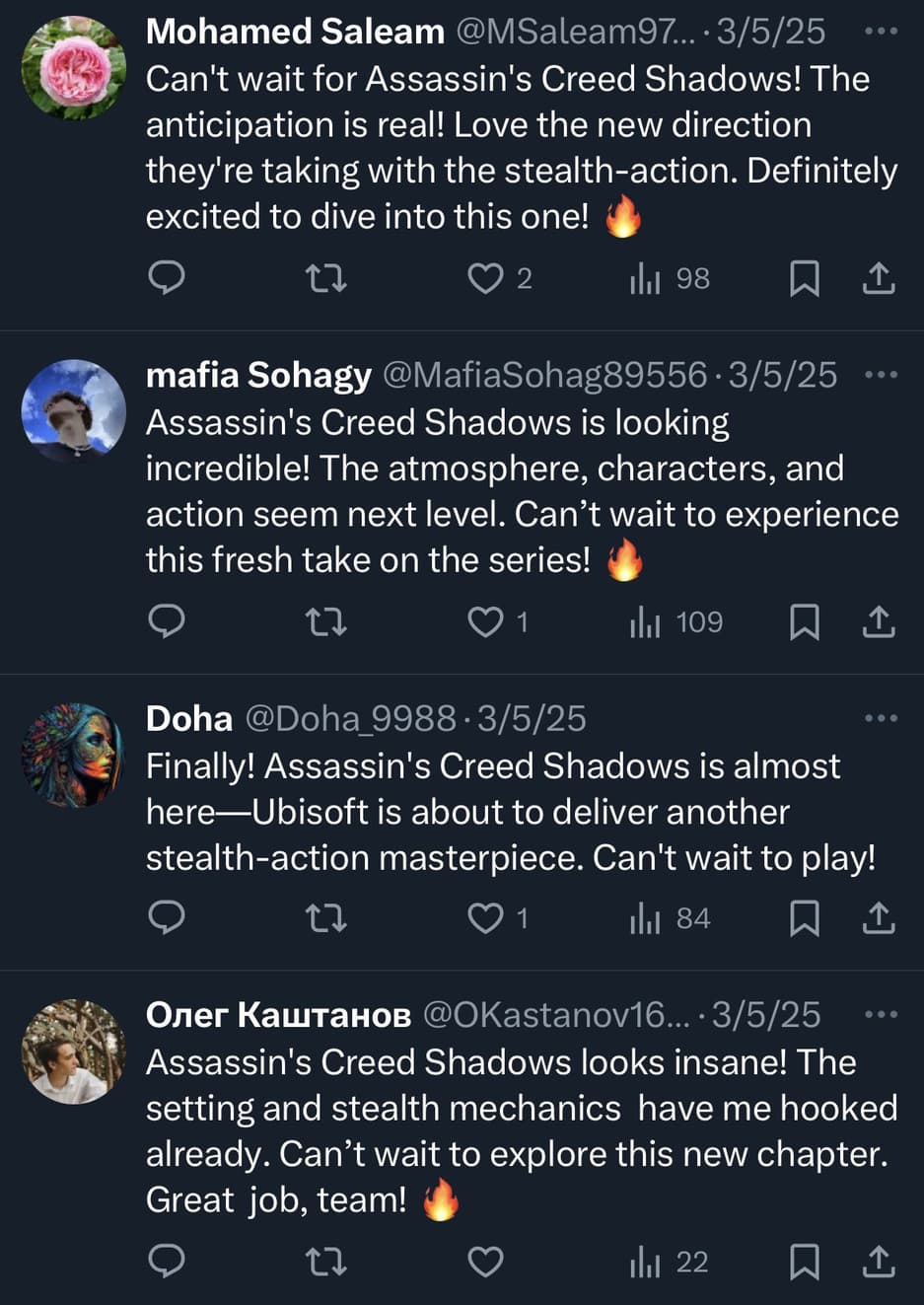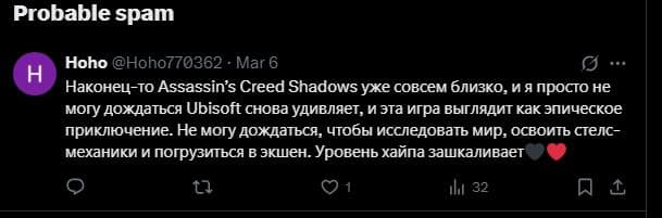 Пользователи сети обратили внимание на повышенную активность ботов под публикациями, связанными с Assassin's Creed Shadows. Созданные относительно недавно учетные записи оставляют одинаковые по смыслу и почти идентичные по содержанию комментарии, нахваливающие игру.