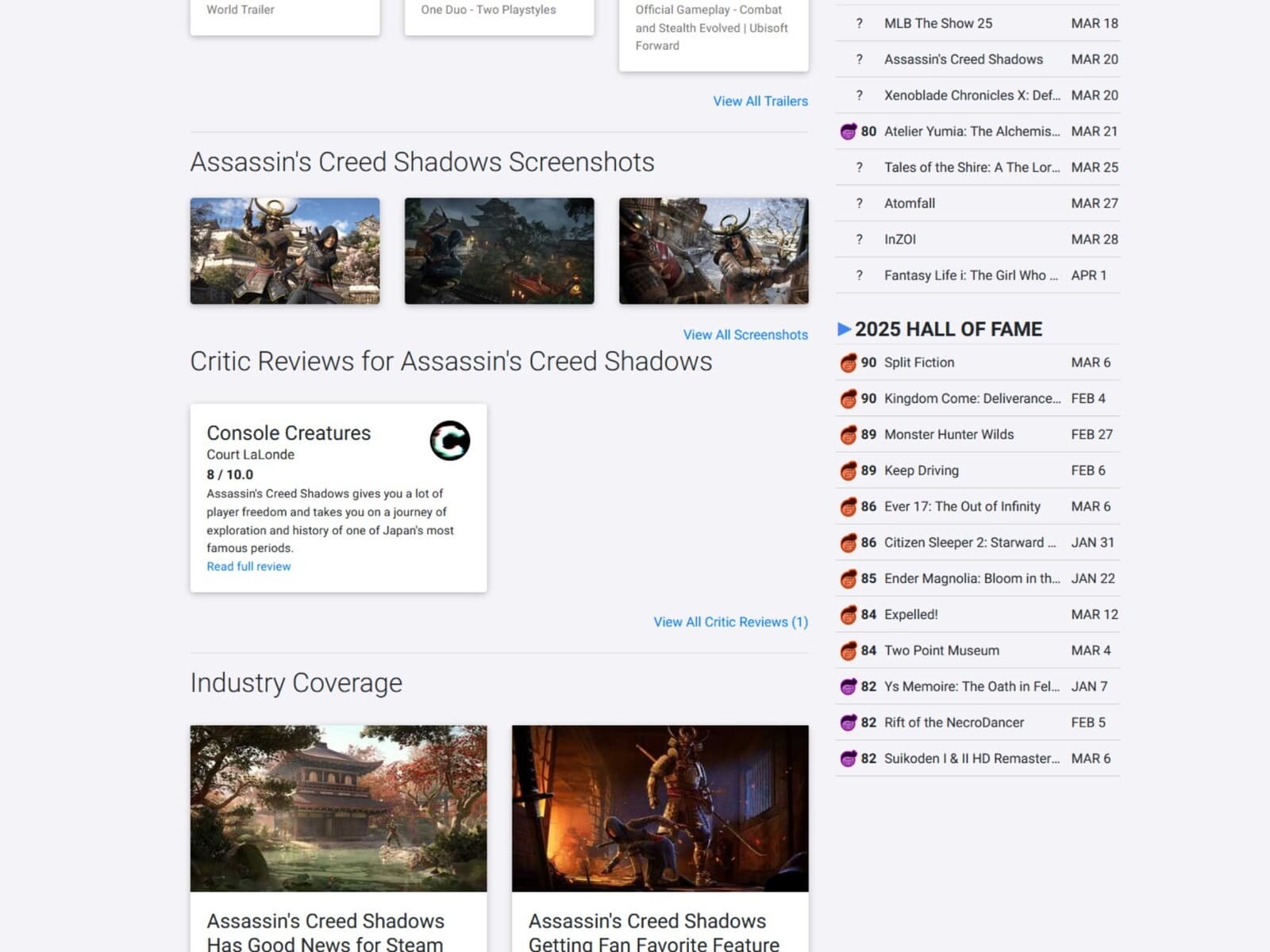 Console Creatures оценивает Assassin's Creed Shadows чуть менее позитивно, поставив оценку 8/10. Рецензенту понравилась свобода и исследования в игре Ubisoft.