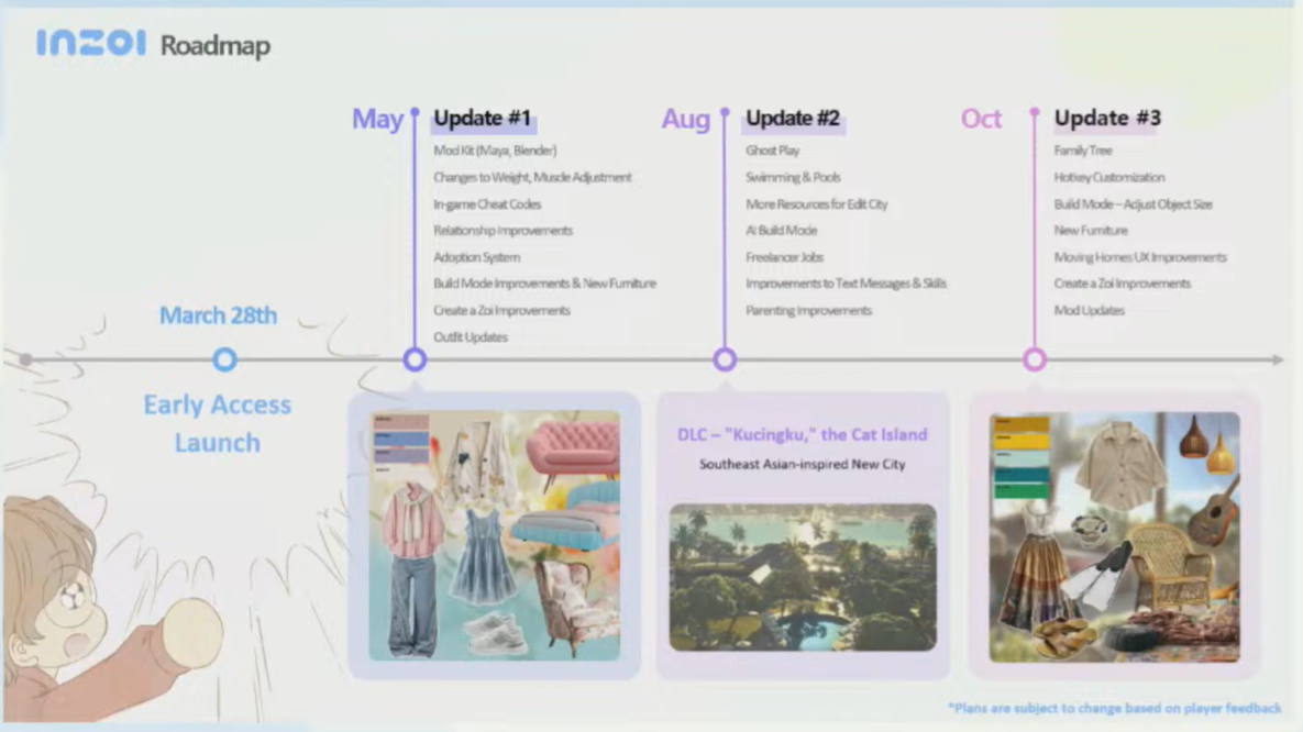 До конца 2025 года для inZOI должны выпустить серию крупных обновлений, примерно каждые 3 месяца собираются добавлять новый контент.