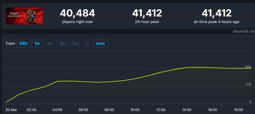 Онлайн Assassin's Creed Shadows в Steam в определенный момент достиг 41 тысячи игроков, но сейчас пошел на спад. Вероятней всего, на выходных ситуация изменится.